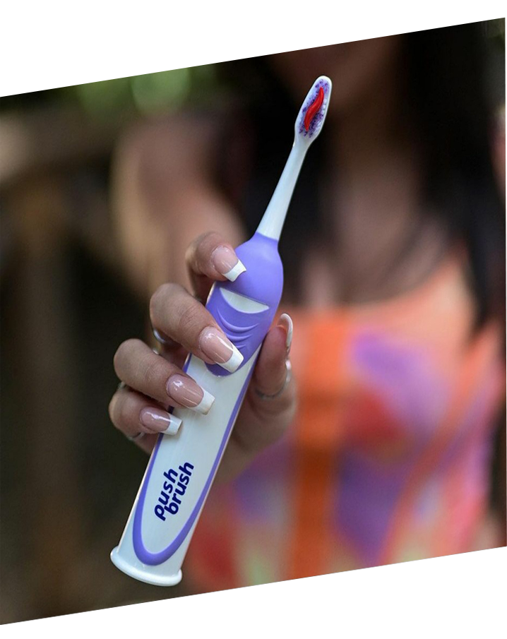 The new PUSH BRUSH toothbrush with high-quality toothpaste in the handle. Applying toothpaste to the bristles has never been easier. No squeezing tubes. No mess. A special mechanical pump delivers the toothpaste from the brush directly onto the bristles!