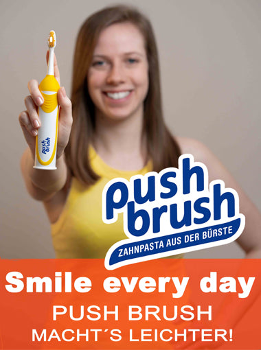 Basta premere lo spazzolino con un dito e si parte. Scoprite lo spazzolino PUSH BRUSH con dentifricio. Il dosaggio esatto sulle setole, senza la fastidiosa apertura, chiusura e spremitura dei tubetti di dentifricio, funziona quasi da solo.